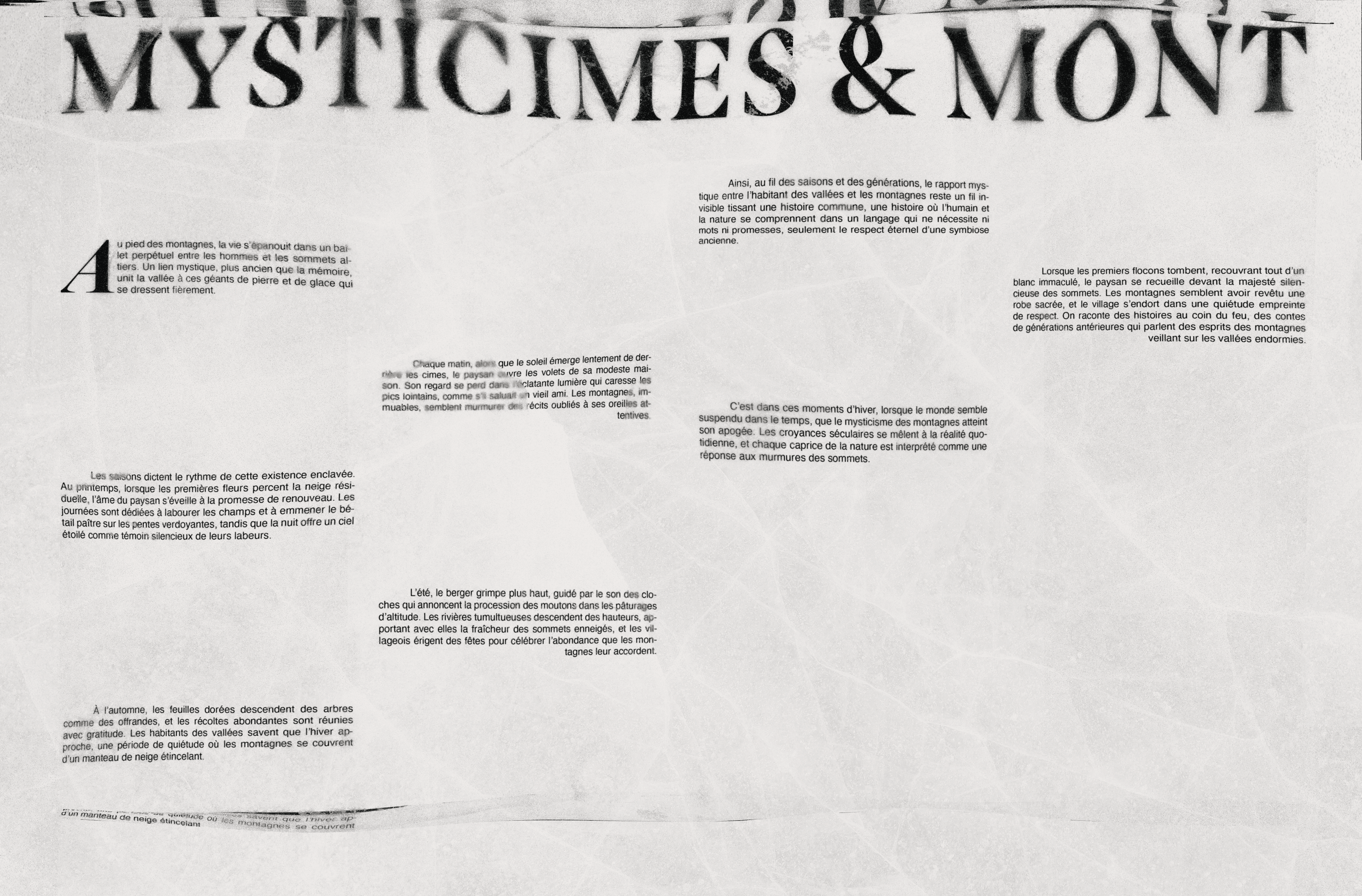"Ascension", an editorial project unveiling the mysteries held by the mountains and their eternal connection to humankind. The concept was shaped around the idea of the mountain as a sacred presence — timeless, immense, and enigmatic. The visual identity embraced a raw, textured aesthetic, echoing stone, ice, and echoing winds, to capture both the grandeur and the mysticism of these natural giants.
