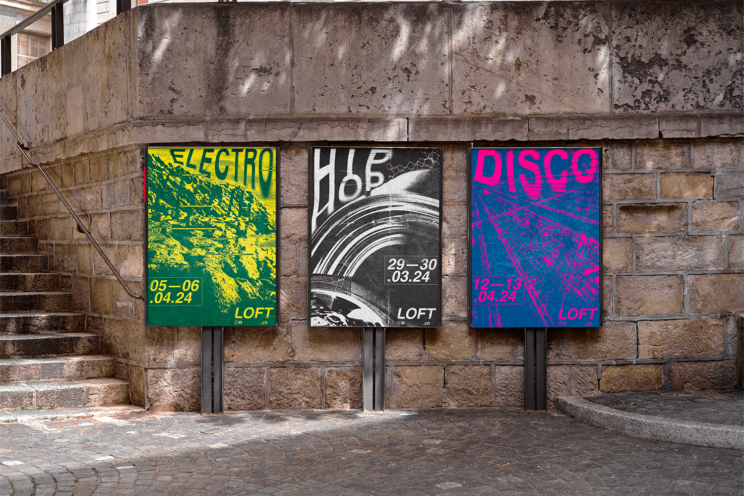 "The Loft", an iconic nightlife space in Lausanne, makes its return with a bold series of posters that reinterpret the club’s spirit through raw textures, vivid contrasts, and distorted type. Each visual explores a different musical identity—Hip-Hop, Electro, and Disco—capturing the diversity and energy of the nights while uniting them under a coherent graphic direction.