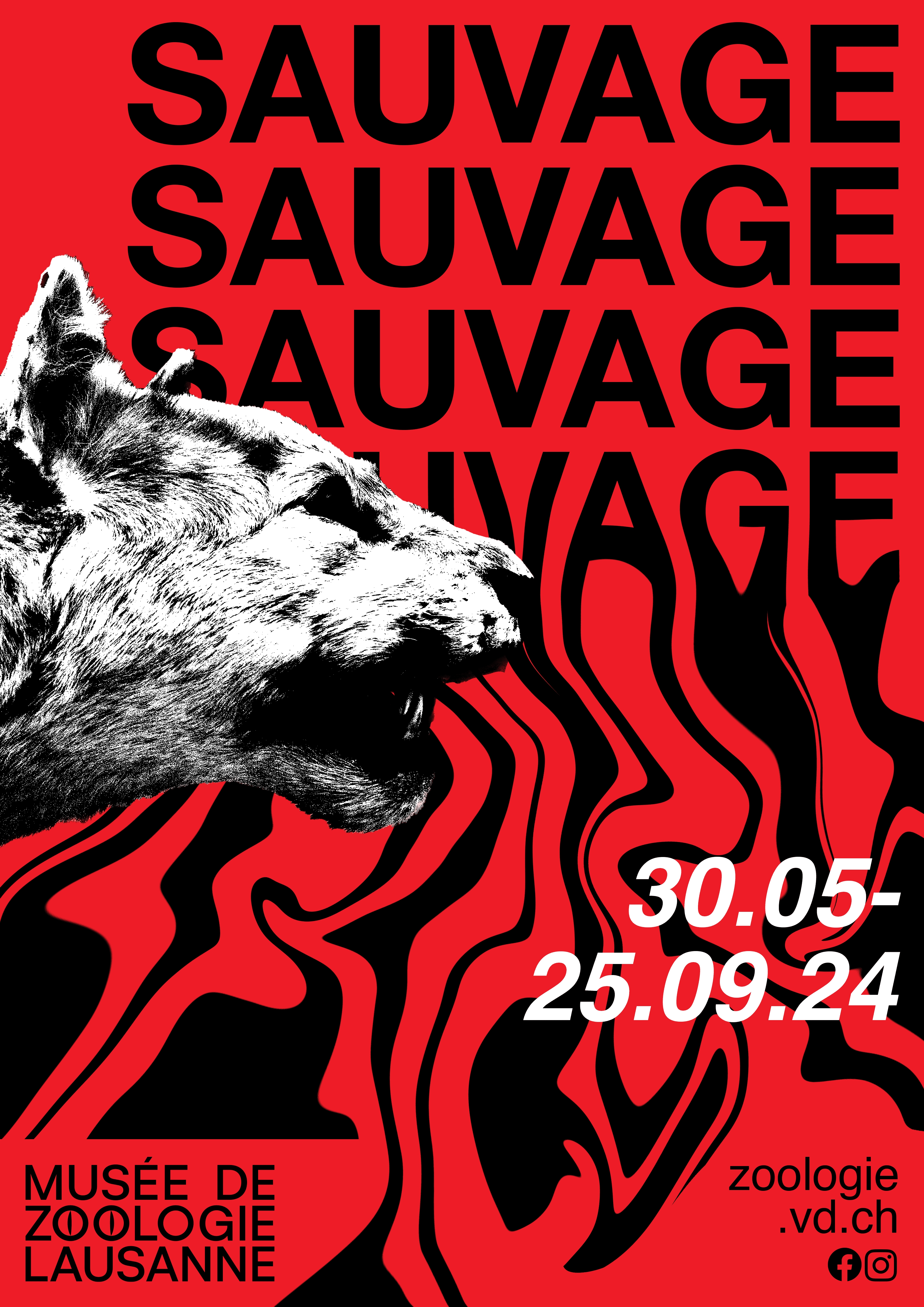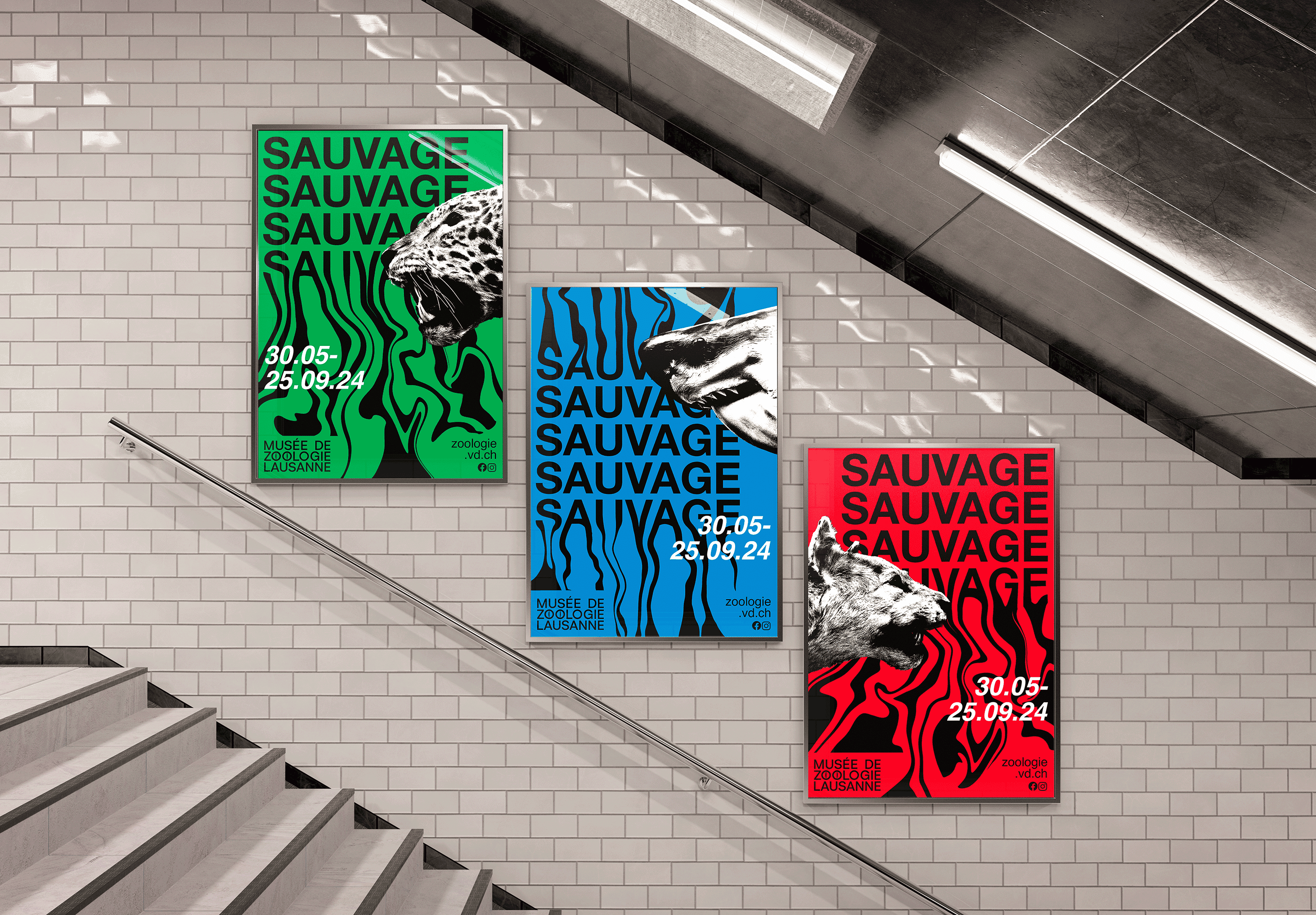 The Musée de zoologie de Lausanne presents Sauvage through a striking series of posters designed to bring the raw intensity of the animal world into the urban space. The visual identity combines bold color fields, high-contrast imagery, and distorted, repetitive typography to express the power, instinct, and diversity of wildlife. Each poster focuses on a different species, creating a system that is both modular and cohesive, while reinforcing the exhibition’s strong and immediate visual impact.